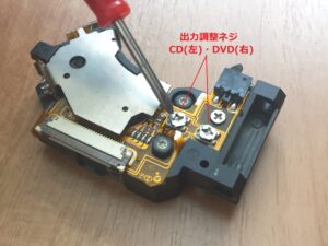 ピックアップレンズの裏にはDVD・CDそれぞれのレーザーを出力調整するネジがあり、時計回りに少しずつ回すことで出力を強くする事が出来ます。出力を強くし過ぎると故障するのと、調節して再生確認の繰り返しが大変なのでおすすめはしません。