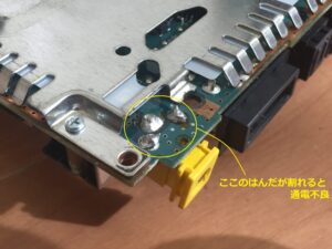PS2本体とACアダプターをこの黄色いパーツ1点で支えているため、裏面のはんだが割れてしまうと通電しない、電源が入らないという状態になります。その場合にはハンダを付け直すことが出来れば、また通電が出来る可能性が高いです。