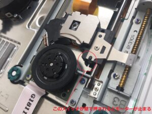 電源を入れてディスクトレーを閉じると、ユニットのモーターが回転しピックアップレンズが手前に下がります。最下部まで下がるとレンズのスイッチが壁で押され、定位置まで来たことを知らせてモーターが止まるという仕組みですが、スイッチが反応しないとモーターが回り続け異音を発します。