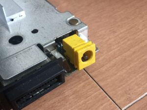 PS2本体とACアダプターをこの黄色いパーツ1点で支えているため、裏面のはんだが割れてしまうと通電しない、電源が入らないという状態になります。その場合にはハンダを付け直すことが出来れば、また通電が出来る可能性が高いです。