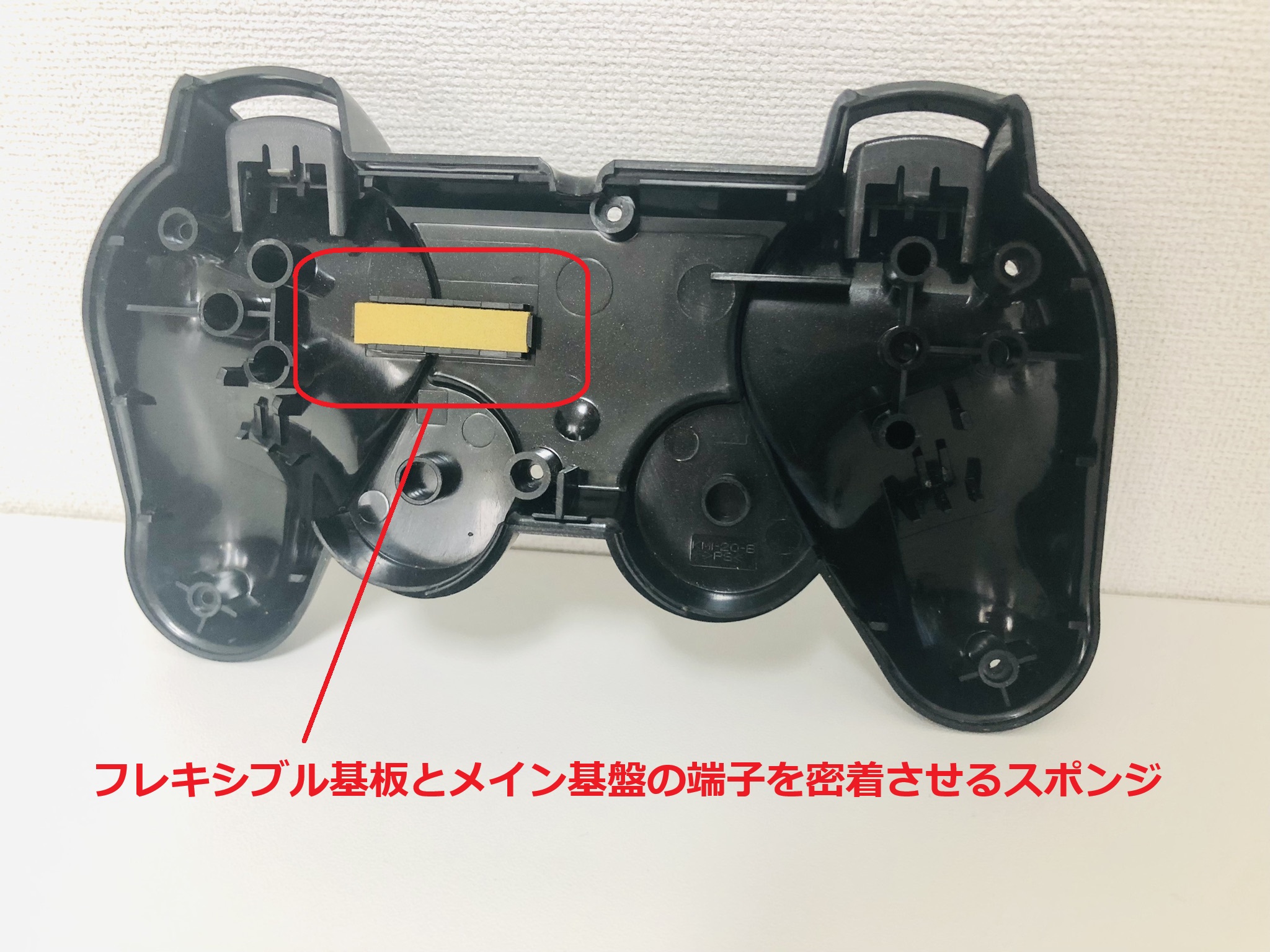 コントローラーの背面カバーについているスポンジが押す形で、フレキシブル基板とメイン基板の端子が密着するという構造ですが、このスポンジがヘタる(薄くなる)と端子の密着がずれてしまい、勝手に動くという症状が出ます。(スポンジが端子を密着させるという構造ではないDUALSHOCK2もあります)