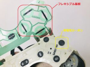 PS2のコントローラーはボタンを押すと、その信号が内部のフレキシブル基板を通してメインの基盤に伝わります。