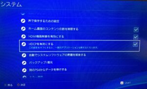 もしディスクに問題がないのにBD・DVDが再生できない場合は、PS4の設定で「HDCPが無効」になっていることが原因の場合があります。(HDCPの有効・無効とは、BD・DVDなど著作権制限がかかっているコンテンツを利用する場合に、有効にすることでこのコンテンツを録画しないよ、再生するだけだよという意思表示をするようなものです)