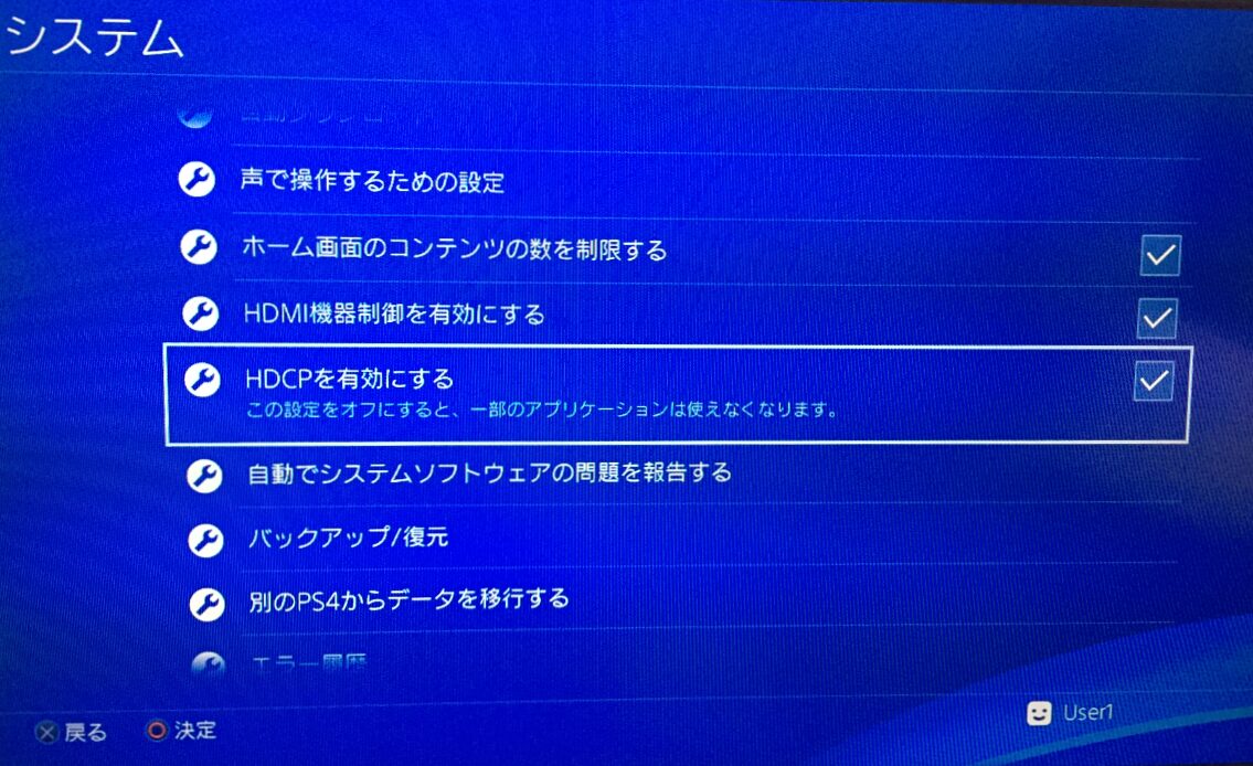 もしディスクに問題がないのにBD・DVDが再生できない場合は、PS4の設定で「HDCPが無効」になっていることが原因の場合があります。(HDCPの有効・無効とは、BD・DVDなど著作権制限がかかっているコンテンツを利用する場合に、有効にすることでこのコンテンツを録画しないよ、再生するだけだよという意思表示をするようなものです)