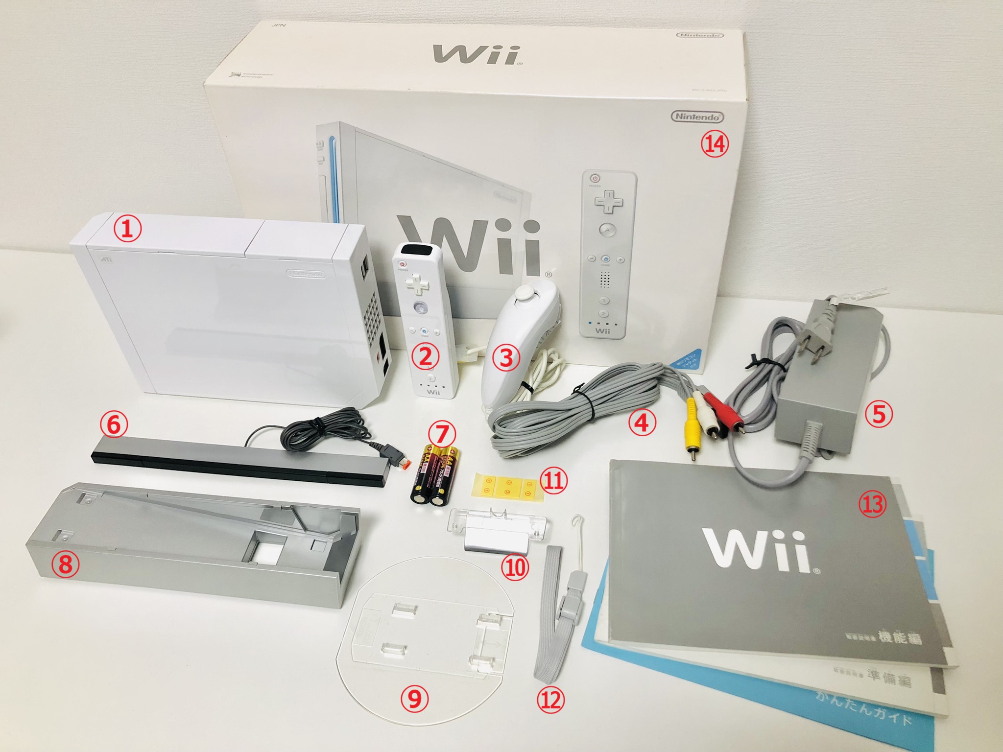 上記の付属品がWii本体のセット内容になります。なくても問題ない付属品も多く、Wiiで遊ぶために必要なものは1~7までが揃っていればプレイが可能です。