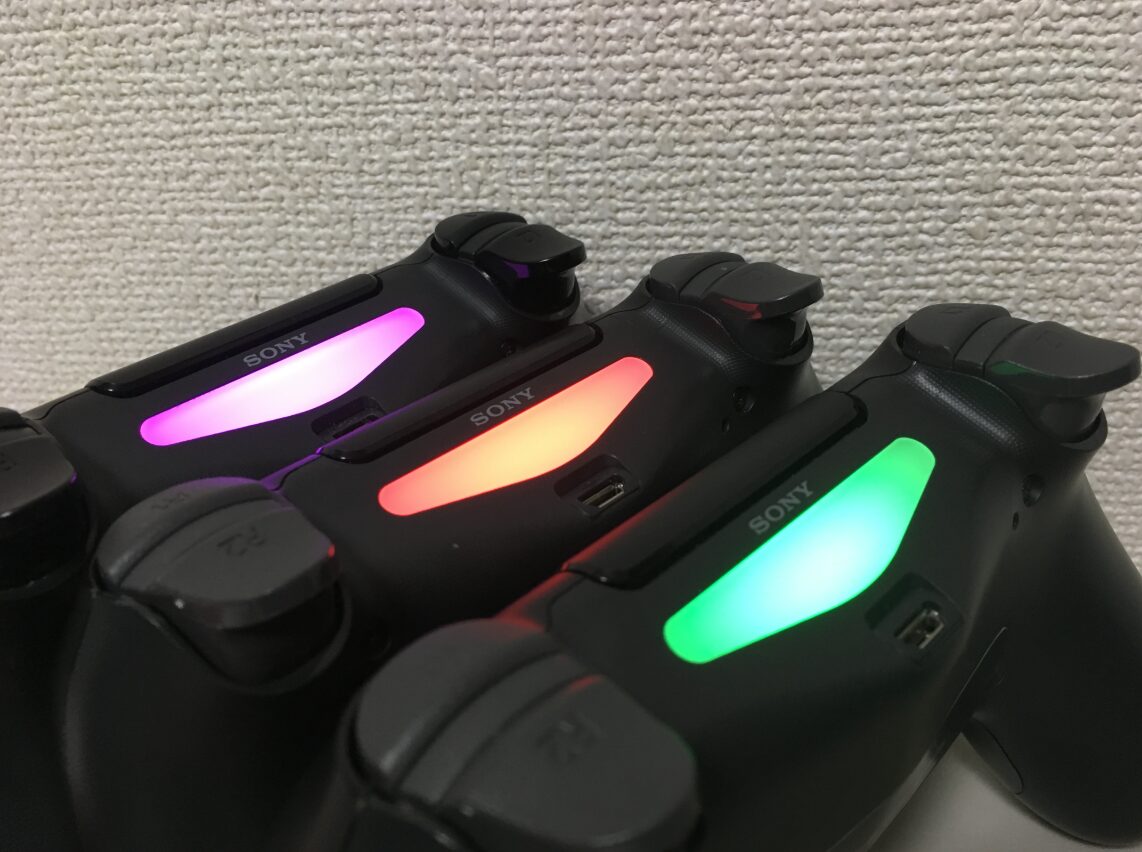 ペアリングが完了すると、繋がれたコントローラーの数・順番によって、上部のライトバーが青・赤・緑・ピンクに点灯します。ペアリング接続できないと、ライトバーは「白点滅」をくり返しますが、そのような時の対処法をいくつか挙げたいと思います。