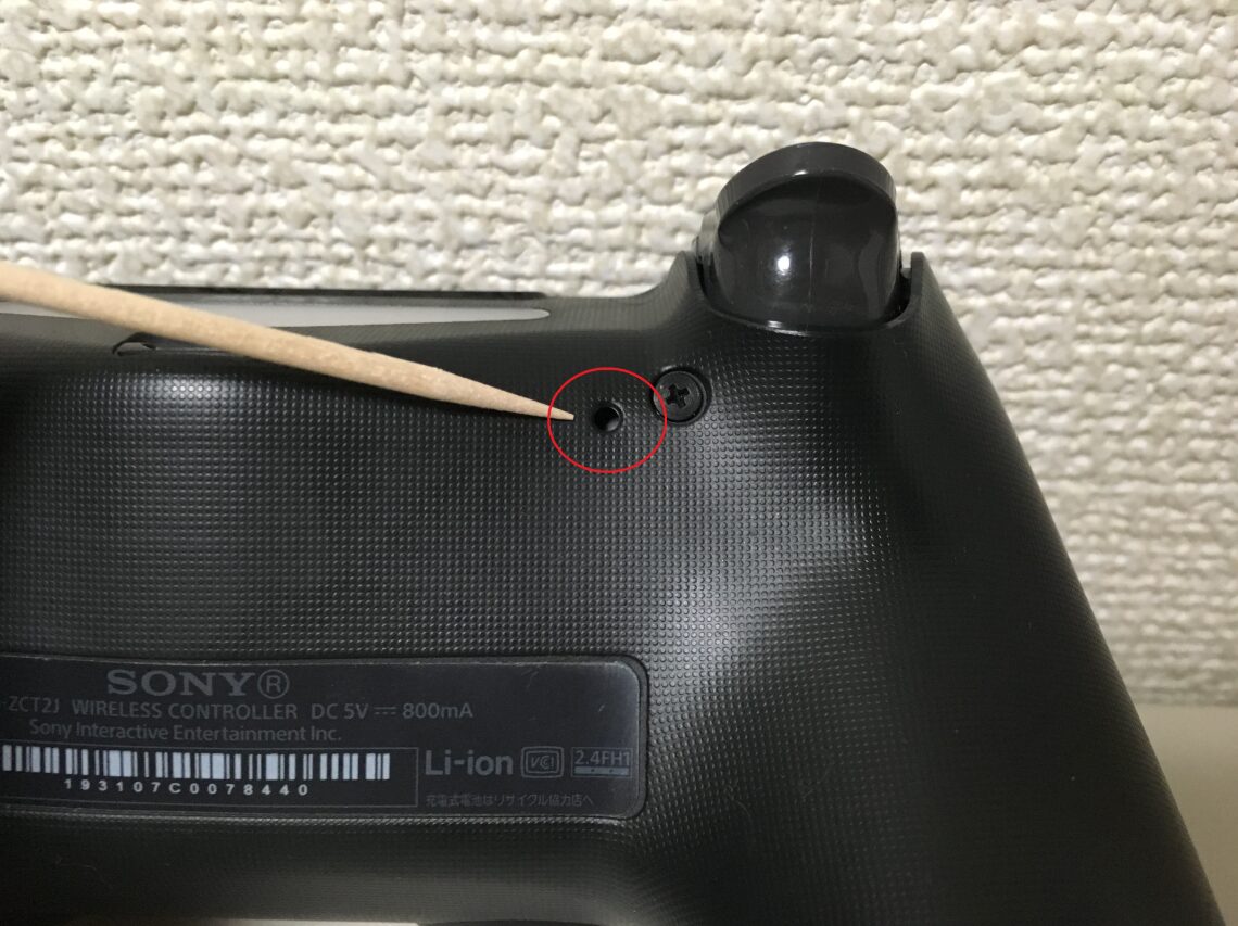 コントローラーの裏側には小さな穴(リセットボタン)があり、爪楊枝などの細い棒でこのボタンを押すとコントローラーの状態をリセット出来ます。リセットしたらPSボタンを押して再度ペアリングを試してみてください。